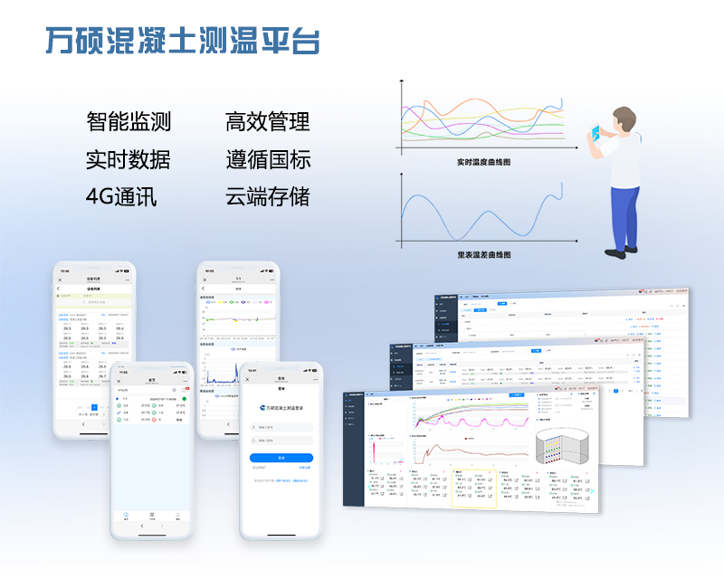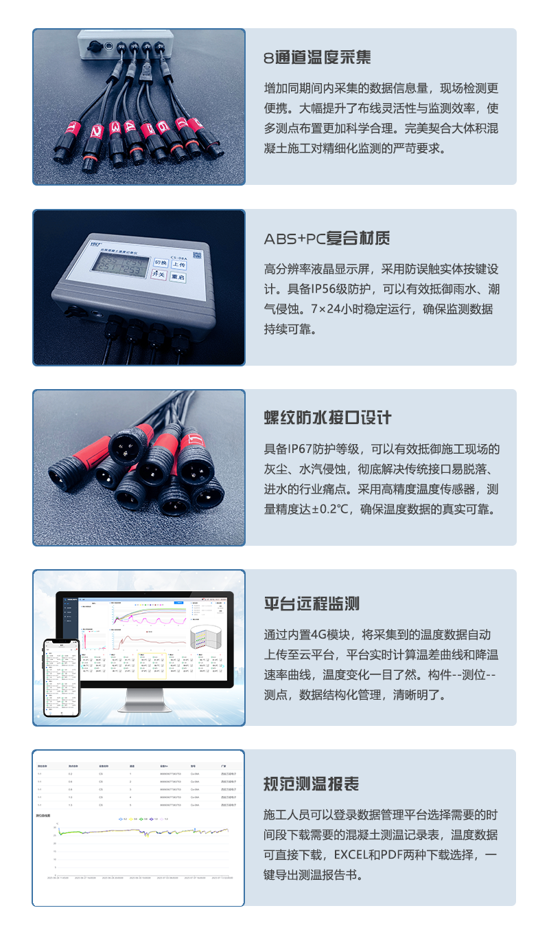 产品严格遵循 GB 50496-2018《大体积混凝土施工标准》 及 GB/T 51028-2015《大体积混凝土温度测控技术规范》 等国家标准,对监测平台进行了全方位智能化升级。