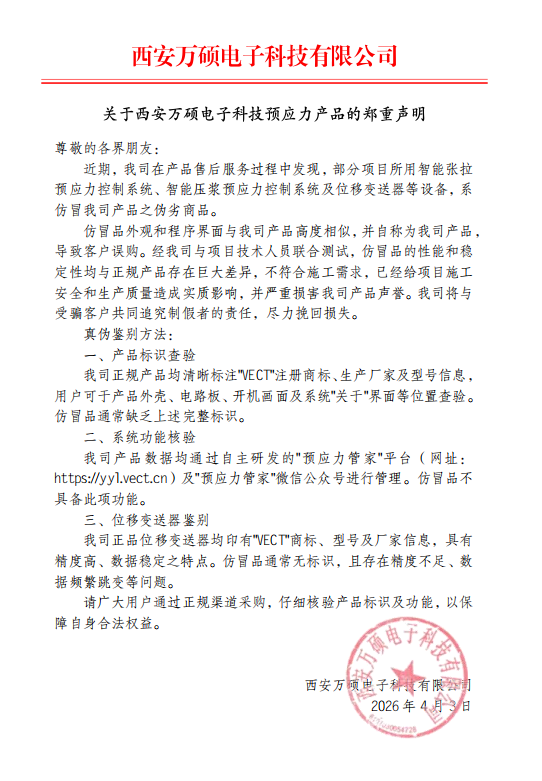 近期,我司在产品售后服务中发现部分项目的智能张拉预应力控制系统、智能压浆预应力控制系统和位移变送器等设备为我司产品的仿冒品。